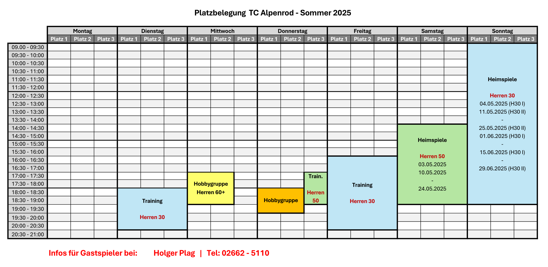 Belegungsplan Sandplätze TC Alpenrod – Sommersaison 2025